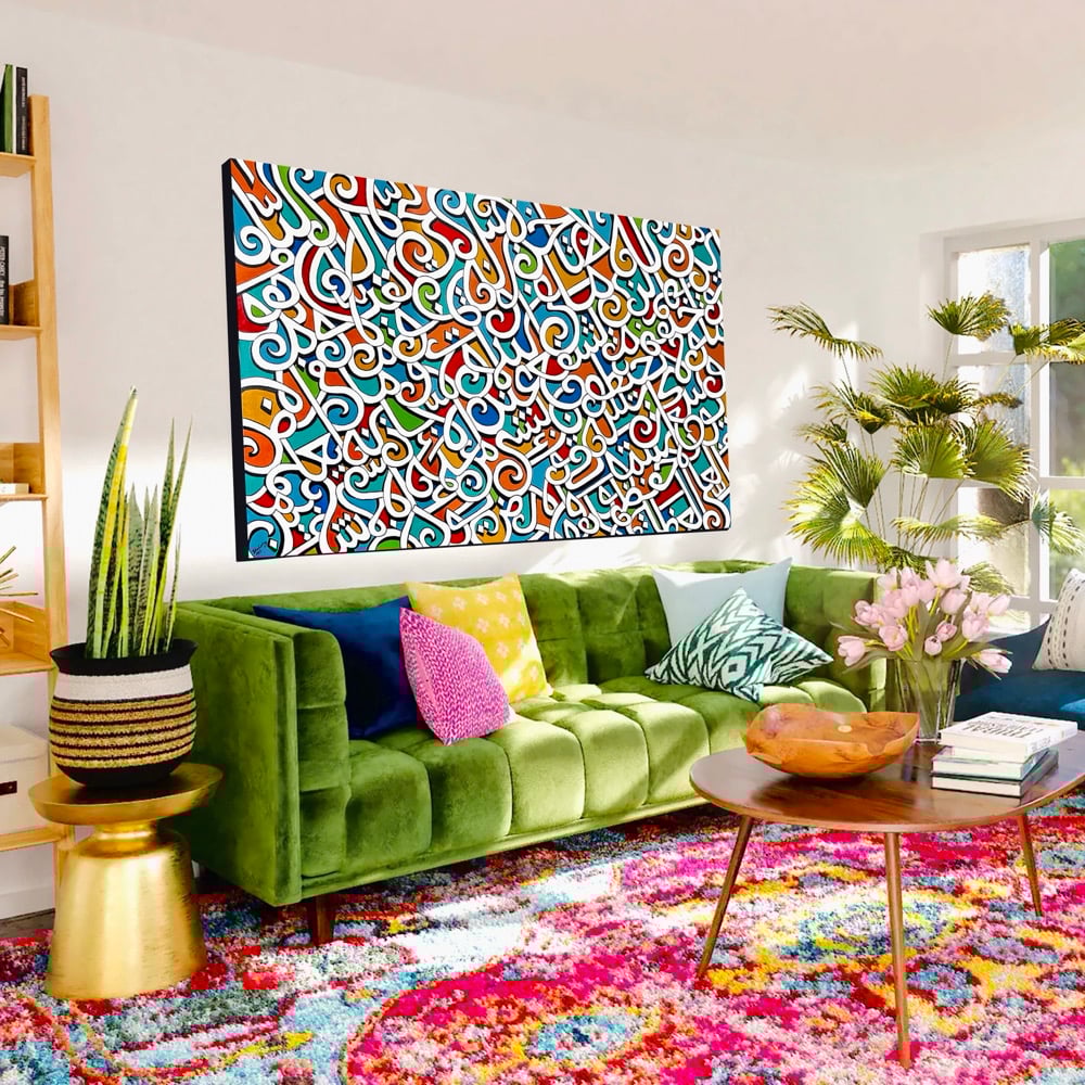 This striking hand-painted acrylic on canvas (150 x 100 cm) radiates with bold hues of red, orange, blue, and green, commanding presence and depth. In Zahra’s signature Swirlligraphy style, the sacred words of Ayat al-Kursi, ‘The Verse of the Throne’, unfold across the composition, merging timeless scripture with contemporary abstraction.